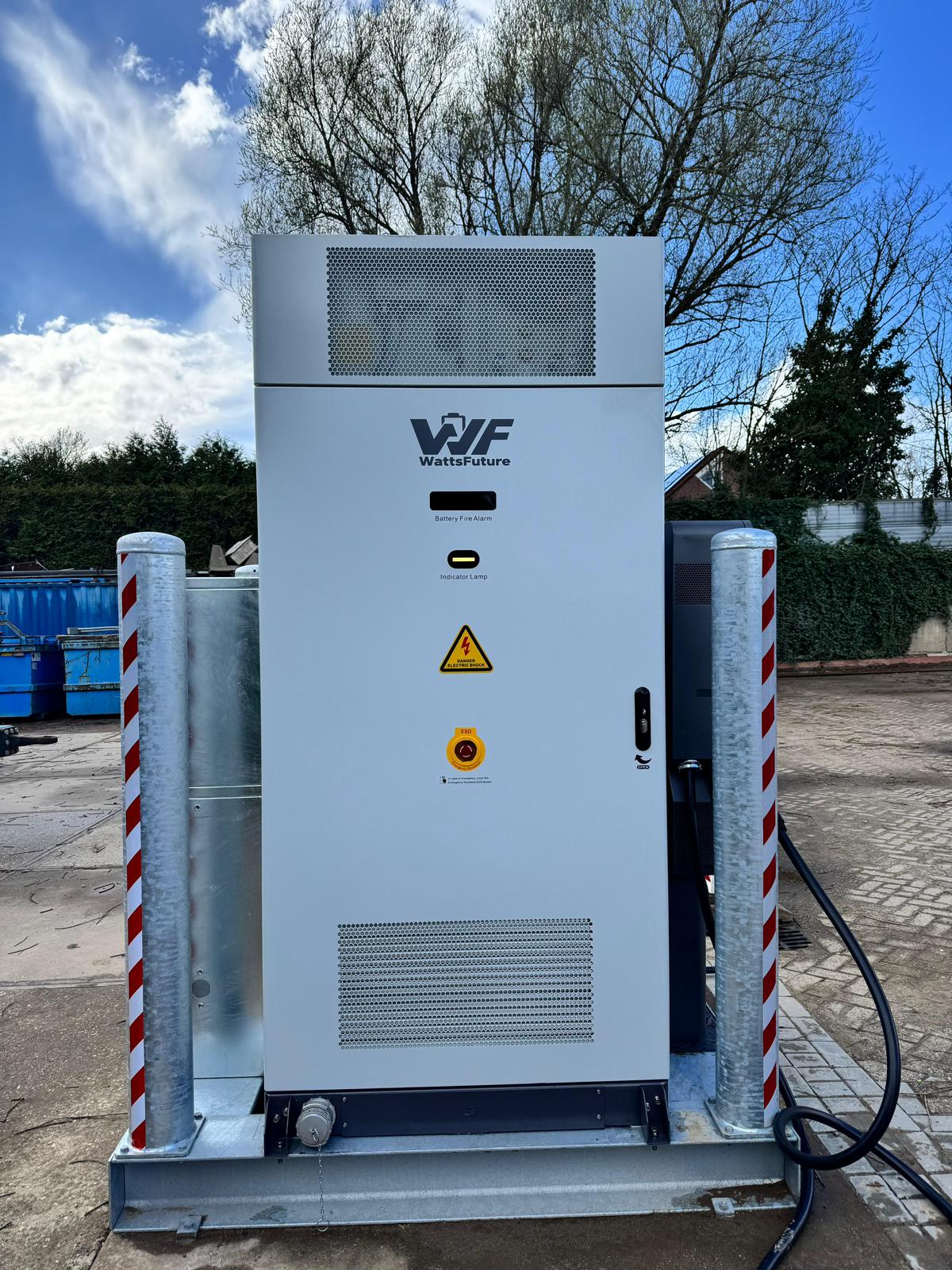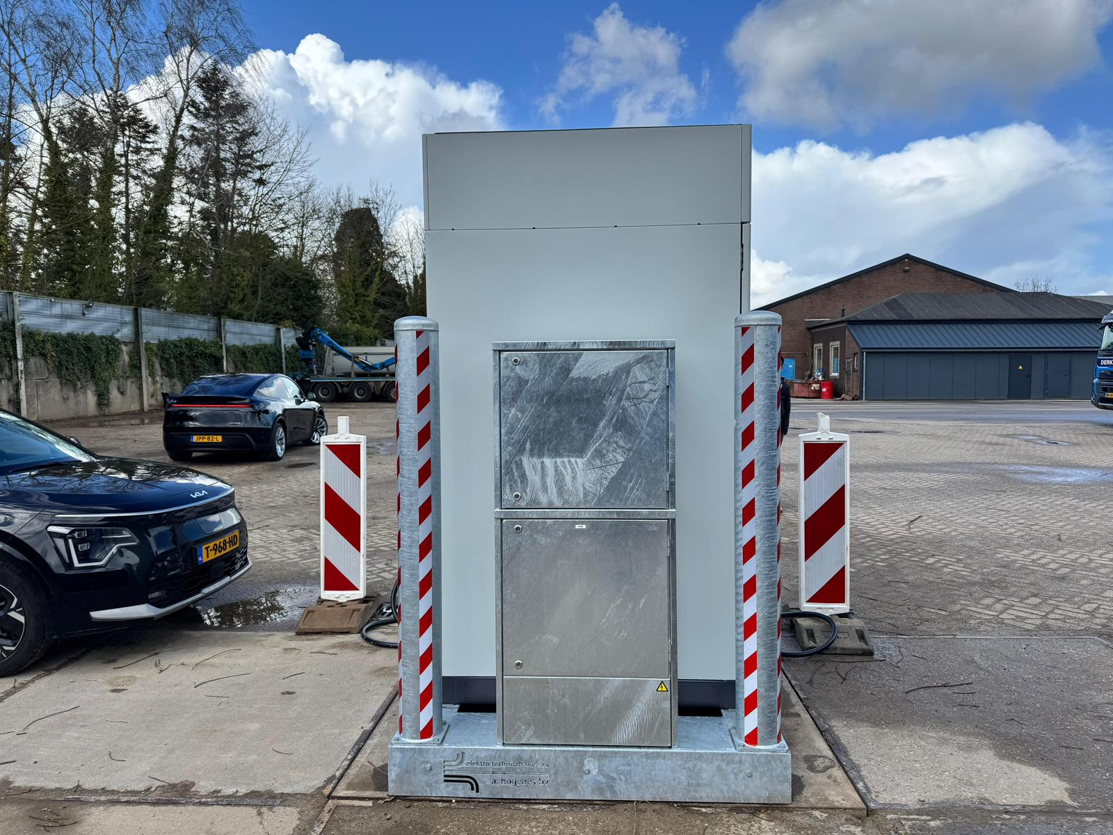 De skid staat midden op het terrein, precies waar hij het meest nuttig is. Aanrijbeveiliging is standaard onderdeel van het frame, zodat er geen aparte bouwkundige constructie nodig is. Het energiemanagementsysteem zorgt ervoor dat de netaansluiting nooit wordt overschreden en dat laden altijd plaatsvindt op het meest voordelige moment. HBE- en ERE-metingen zijn ingebouwd, zodat P.A.M. Derks BV direct profiteert van de beschikbare subsidie-instrumenten voor zero-emissie transport.
